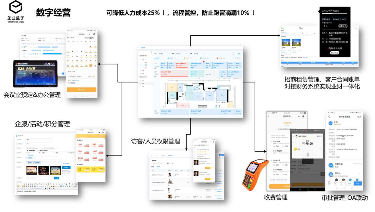 故将企业盒子资产管理业务场景作为数据核心,以微服务架构桥接各类智能硬件,即以园区资产和租约作为数据采集源,实现各类系统数据互联互通,从而形成高效、增值的数字园区。万物感知、万物互联、万物智能,这便是新一代办公园区的“智慧”之处,数字经营之本。