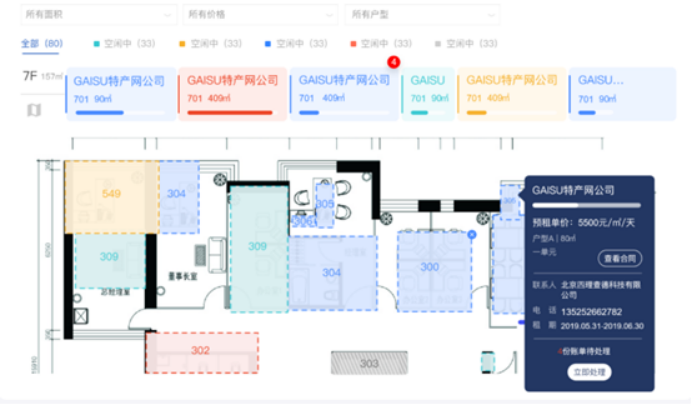 每个房间每个合同可绑定对应的门禁与梯控等通行设备,该设备的通行权限与合同的租期直接关联,入驻该房间人员可通过扫码或扫脸开门,或扫码乘梯至对应楼层,如对应公司租约到期、或欠费不交,可自动关闭其通行权限,避免人工催租尴尬。